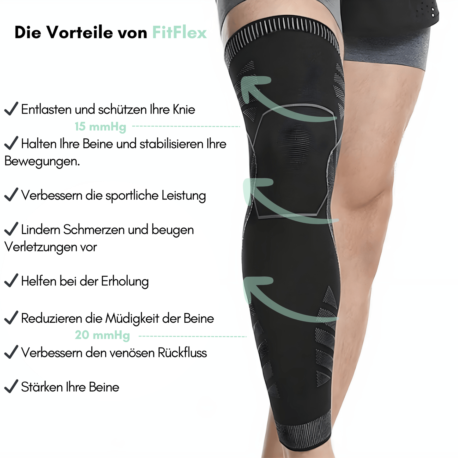 FitFlex übt einen graduellen Druck von 15 bis 20 mmHg aus, der die Blutzirkulation in Ihren Beinen verbessert.
