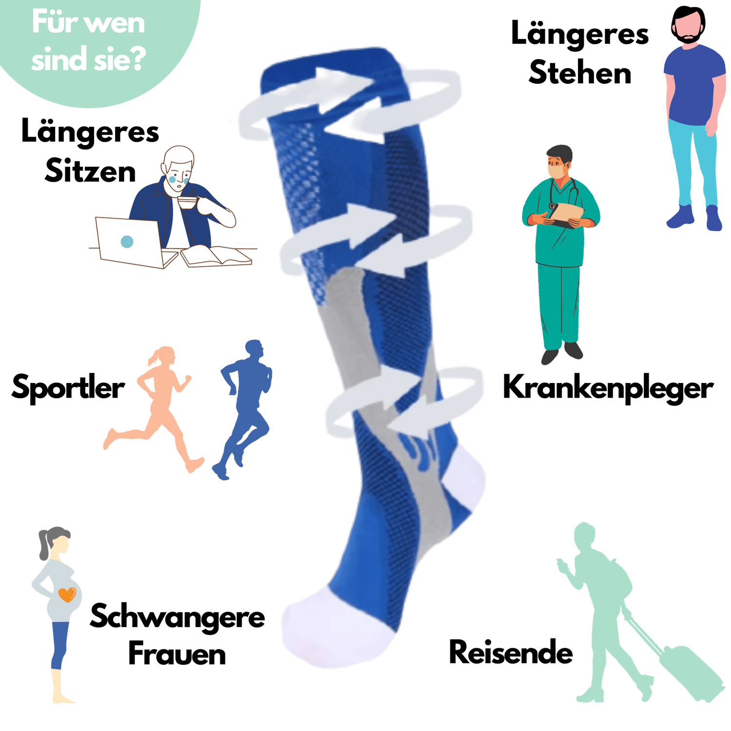 Sie fördern die Blutzirkulation und den Sauerstofffluss, beugen Krämpfen, Müdigkeit und Schwellungen vor und unterstützen die Erholung der Muskeln, während sie das Auftreten von Krampfadern reduzieren.